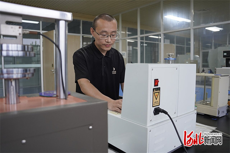 9月28日,河北亿利科技股份有限公司实验室内,工作人员对滤清器零部件进行检测验证。 河北日报记者 魏雨摄